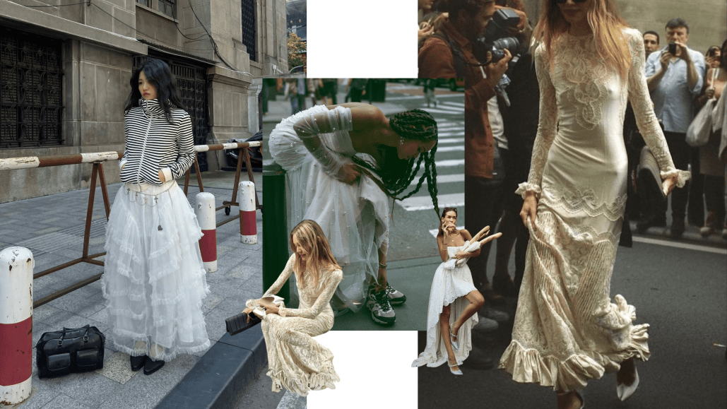 - The Look: “Non-chalant Romance.” It mixes traditional bridal fabrics with grunge or streetwear elements. The vibe is undone elegance: a silk slip dress worn with heavy boots, or a sheer lace skirt paired with an oversized blazer.