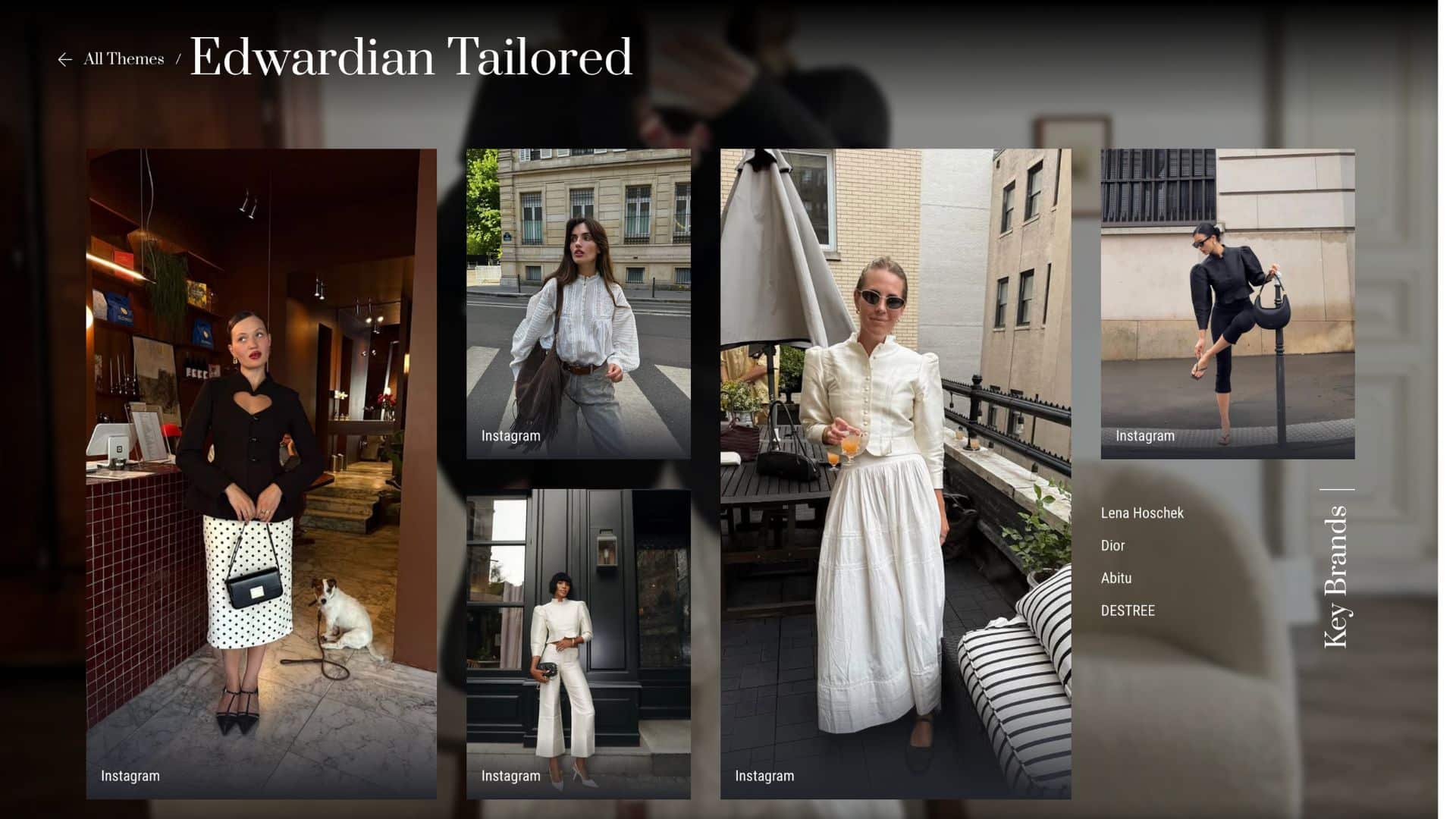 - Search Interest: According to Glimpse, Google searches for “Edwardian fashion” surged 2% over the past year, reaching 12k searches in the past month alone. As romantic tailoring continues to rise, Edwardian Tailored signals a broader shift toward fashion that values softness and structure in equal measure, where history is not replicated, but reimagined for the present.
