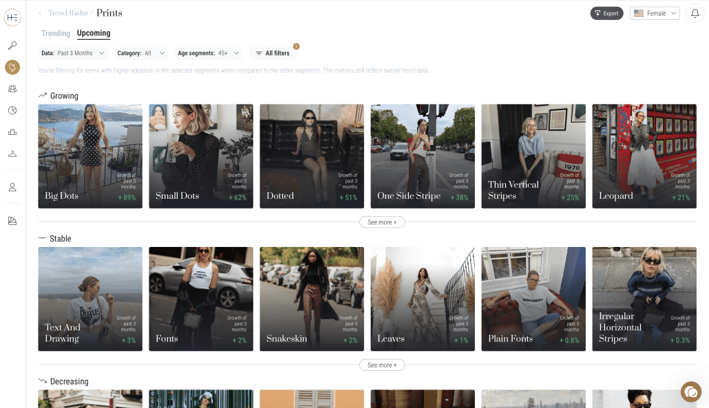 Using Heuritech’s trend forecasting data, brands can anticipate which pieces of clothing, prints, colors, textiles will gain traction for each season. For instance, for women aged 45+ in the US, Heuritech’s analysis in past 3 months highlights the domination of neutral and classic hues, with brown tops (+14%), black pants (+4%), and gray tops (+3%) leading color growth, suggesting a preference for versatile staples. In terms of shapes, midi skirts (+17%), blouses (+13%), and hip-length outerwear (+11%) stand out, reflecting a polished yet practical aesthetic. Prints show renewed energy through printed dresses (+17%), striped tops (+12%), and printed tops (+11%), combining sophistication with subtle expressiveness.