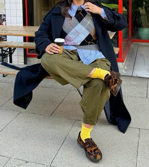 It’s not about dressing “like a grandpa” in a literal sense, it’s about embracing clothing that feels familiar, humble, and oddly fashionable. Think Tyler, The Creator in slouchy slacks and loafers, or Emma Chamberlain pairing vintage trousers with knit vests. It’s style as storytelling: nostalgic, accessible, and personality-driven.