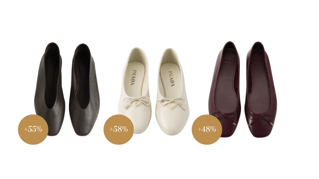 In Europe, All Ballerinas have increased by +55%, Almond-Toe Ballerinas by +58%, and finally, the cutest ones—The Bow Ballerinas—have seen a +48% increase.