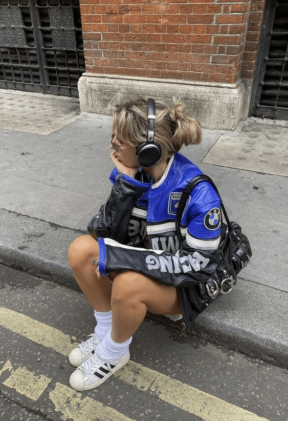 At the heart of this trend lies the iconic racer jacket, a new modern staple for women embracing this look, moving away from the “classic” perfecto jackets. Often styled with mini skirts or oversized pants, this versatile piece adds structure and boldness to any outfit.